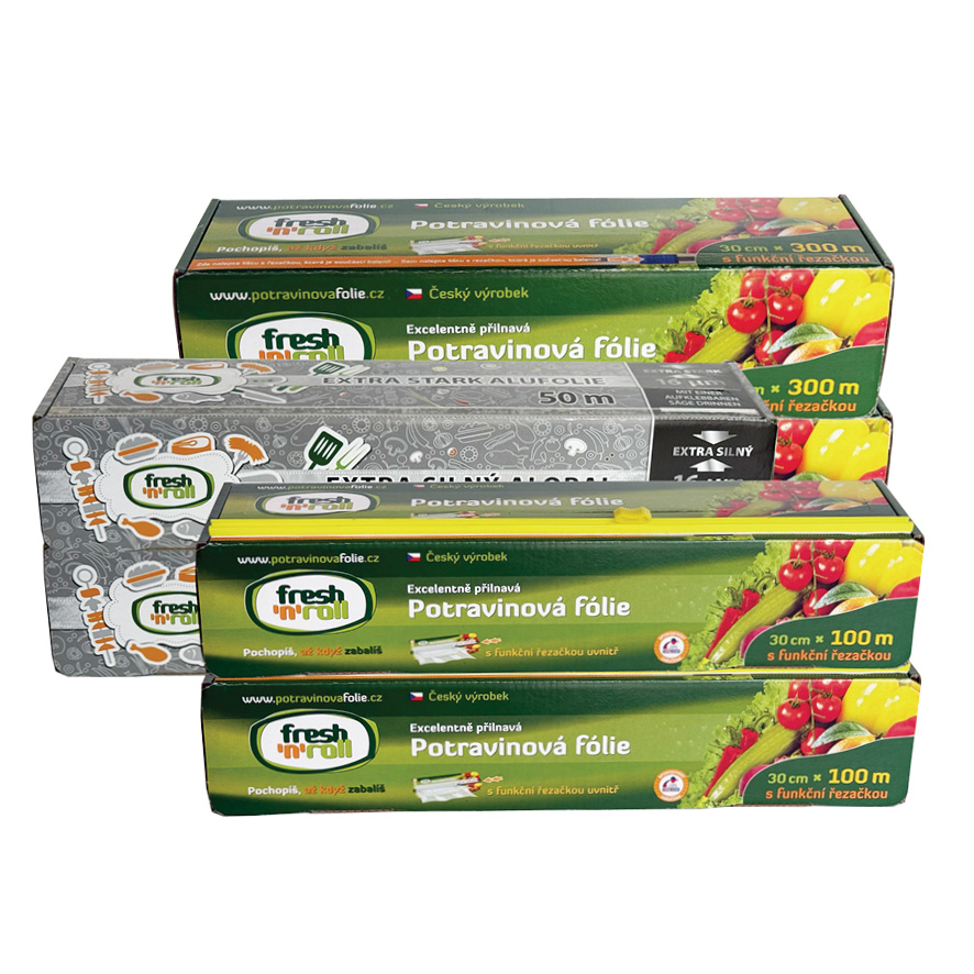 Balíček obsahuje 2 ks Fólie Fresh'n'Roll – krabička s funkční řezačkou – 30 cm/300 m, 2 ks Fólie Fresh'n'Roll – krabička s funkční řezačkou – 30 cm/100 m, 2 ks Alobal Fresh'n'Roll – krabička s funkční řezačkou – 30 cm/50 m